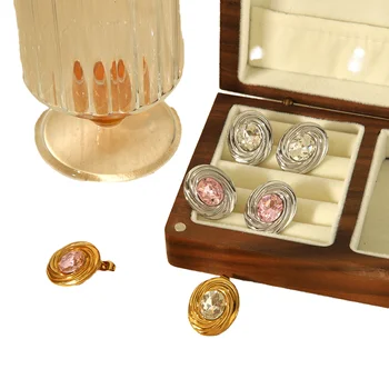 Trendy New 18K Gold Plated Pink Cubic Zirconia Stud Earrings Stainless Steel Jewelry for Women for Anniversary