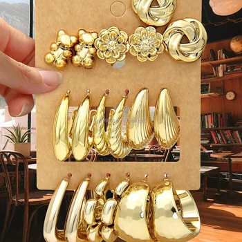 HL New 9Pairs of Fashionable European and American Style Gold Earrings Set As Daily Gifts for Women and Girls